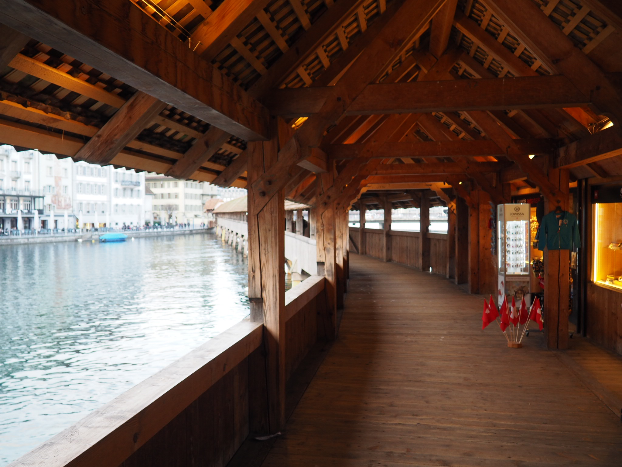 Chapel Bridge (Kapellbrucke) is one of the main Lucerne attractions. The wooden bridge, which interior is covered by painting from the 17th century includes octagonal water bridge, that in medieval age served as prison and torture chamber. The bridge can be easily visited with your buggy, but you need to climb/carry the pram few steps on each side of the entrance. You may also use the moving platform for handicaped, but the time spent waiting is not worth it.